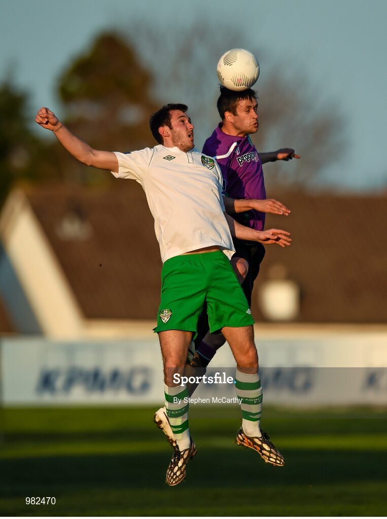 6 April 2015; Tim Clancy, Shamrock Rovers, in action against Kevin Knight, Cabinteely. EA Sports Cup Second Round, Cabinteely v Shamrock Rovers. Stradbrook Road, Blackrock, Co. Dublin. Picture credit: Stephen McCarthy / SPORTSFILE