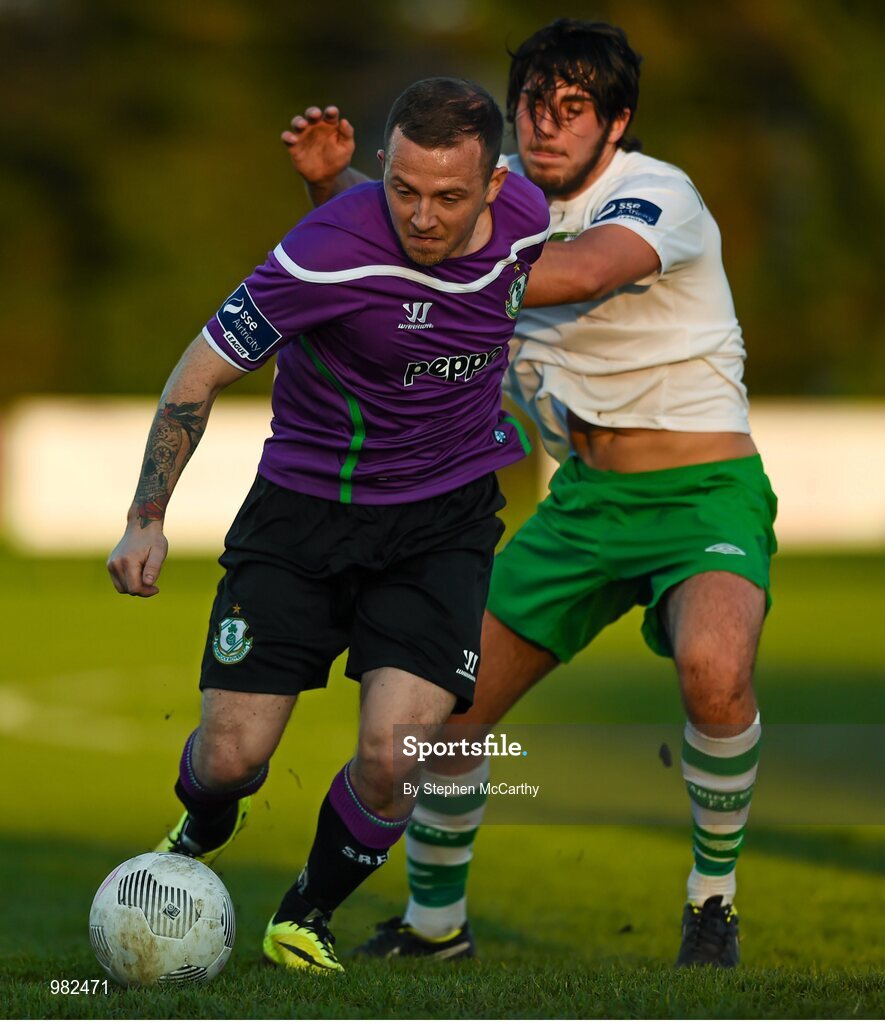 6 April 2015; Gary McCabe, Shamrock Rovers, in action against Evan Finnegan, Cabinteely. EA Sports Cup Second Round, Cabinteely v Shamrock Rovers. Stradbrook Road, Blackrock, Co. Dublin. Picture credit: Stephen McCarthy / SPORTSFILE