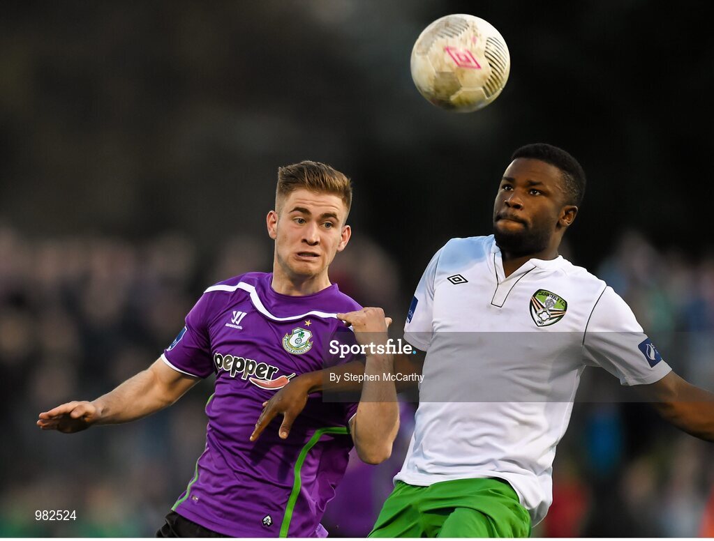6 April 2015; Victor Ekanem, Cabinteely, in action against Gareth McCaffrey, Shamrock Rovers. EA Sports Cup Second Round, Cabinteely v Shamrock Rovers. Stradbrook Road, Blackrock, Co. Dublin. Picture credit: Stephen McCarthy / SPORTSFILE
