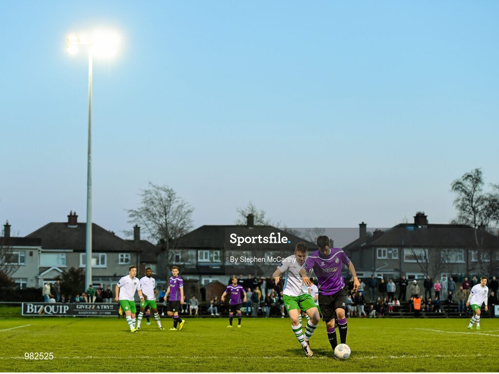 6 April 2015; Tim Clancy, Shamrock Rovers, in action against Robert Maloney, Cabinteely. EA Sports Cup Second Round, Cabinteely v Shamrock Rovers. Stradbrook Road, Blackrock, Co. Dublin. Picture credit: Stephen McCarthy / SPORTSFILE