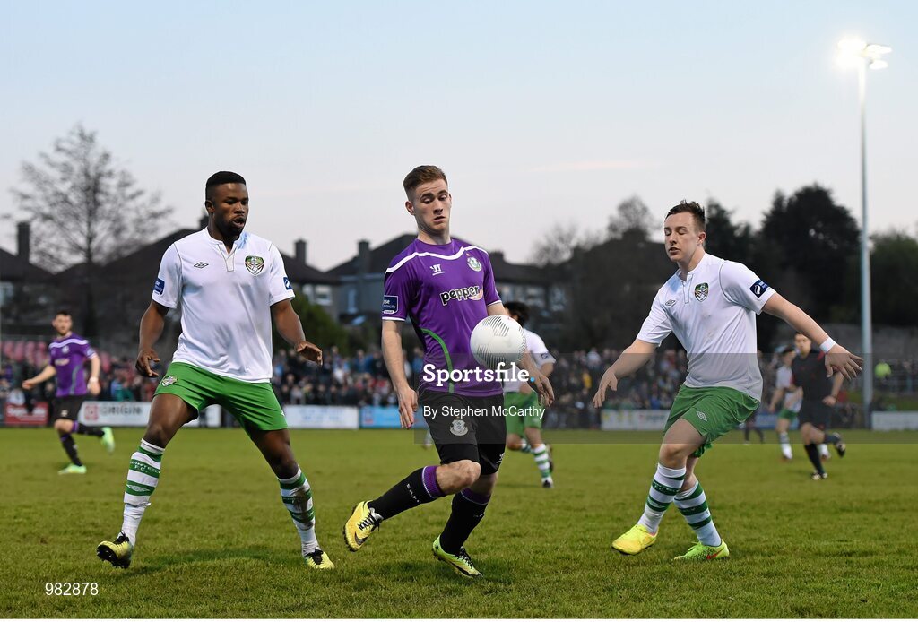 6 April 2015; David O’Connor, Shamrock Rovers, in action against Victor Ekanem, left, and Daniel Campbell, Cabinteely. EA Sports Cup Second Round, Cabinteely v Shamrock Rovers. Stradbrook Road, Blackrock, Co. Dublin. Picture credit: Stephen McCarthy / SPORTSFILE
