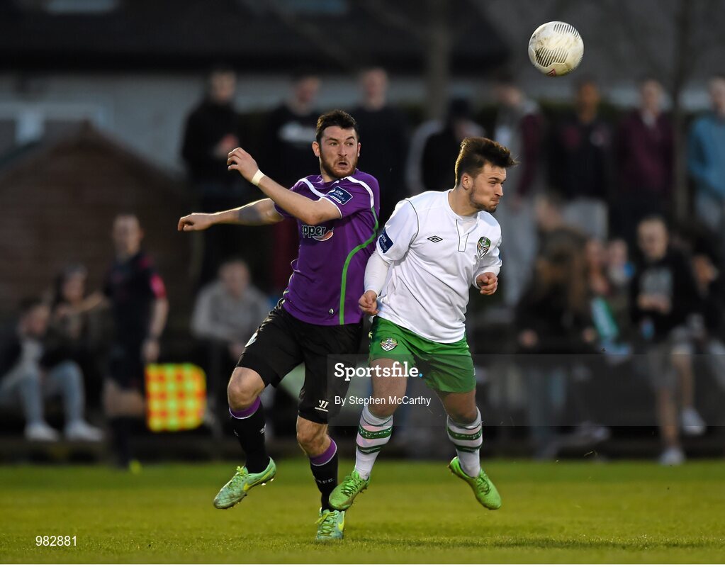 6 April 2015; Jamie McGlynn, Cabinteely, in action against Ryan Brennan, Shamrock Rovers. EA Sports Cup Second Round, Cabinteely v Shamrock Rovers. Stradbrook Road, Blackrock, Co. Dublin. Picture credit: Stephen McCarthy / SPORTSFILE