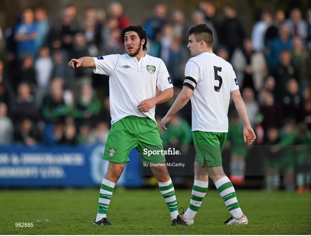 6 April 2015; Evan Finnegan, left, and Robert Maloney, Cabinteely. EA Sports Cup Second Round, Cabinteely v Shamrock Rovers. Stradbrook Road, Blackrock, Co. Dublin. Picture credit: Stephen McCarthy / SPORTSFILE