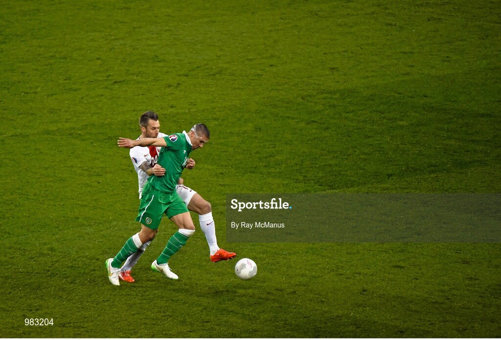 29 March 2015; Jon Walters, Republic of Ireland, in action against Jakub Wawrzyniak, Poland. UEFA EURO 2016 Championship Qualifier, Group D, Republic of Ireland v Poland. Aviva Stadium, Lansdowne Road, Dublin. Picture credit: Ray McManus / SPORTSFILE