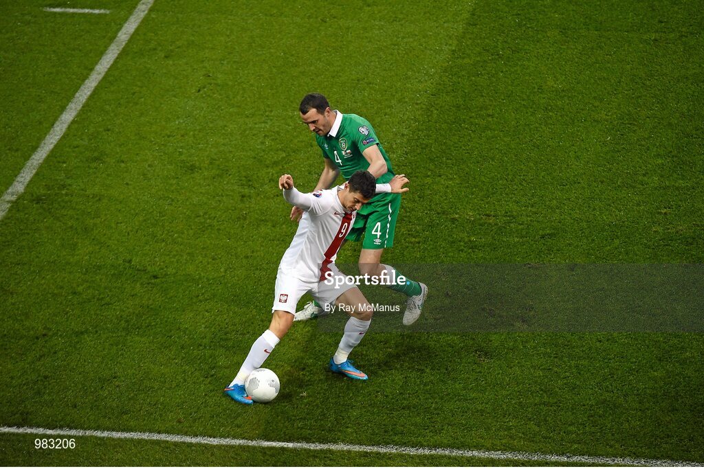 29 March 2015; Robert Lewanowski, Poland, in action against John O'Shea, Republic of Ireland. UEFA EURO 2016 Championship Qualifier, Group D, Republic of Ireland v Poland. Aviva Stadium, Lansdowne Road, Dublin. Picture credit: Ray McManus / SPORTSFILE
