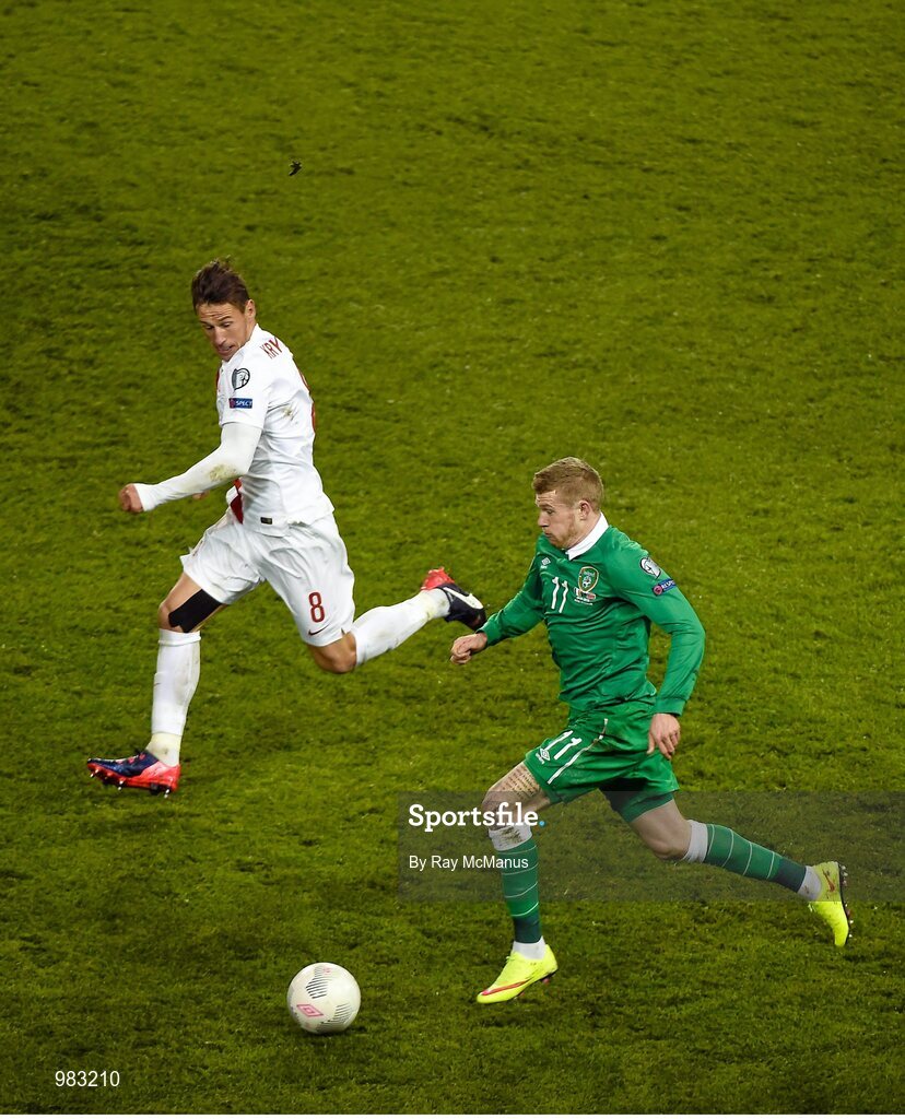 29 March 2015; James McClean, Republic of Ireland, in action against Grzegorz Krychowiak, Poland. UEFA EURO 2016 Championship Qualifier, Group D, Republic of Ireland v Poland. Aviva Stadium, Lansdowne Road, Dublin. Picture credit: Ray McManus / SPORTSFILE