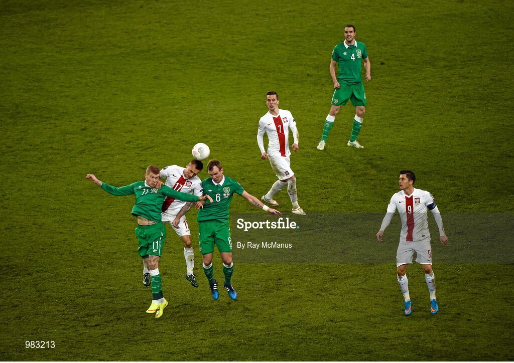 29 March 2015; Republic of Ireland's James McClean, left, Glenn Whelan and John O'Shea, right, in action against Poland's Krzysztof Maczynski, left, Arkadiusz Milik and Robert Lewandowski, right. UEFA EURO 2016 Championship Qualifier, Group D, Republic of Ireland v Poland. Aviva Stadium, Lansdowne Road, Dublin. Picture credit: Ray McManus / SPORTSFILE