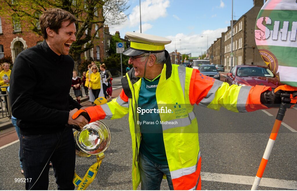 11 May 2015; Former Republic of Ireland International Kevin Kilbane surprises Sheriff YC legend Noel Kelligher, and lollipop man at St Laurence O'Toole's NS on Seville Place in the inner city, with VIP tickets to the FAI Junior Cup Final at the Aviva Stadium on Sunday during the FAI Junior Cup Tour and Community Day. Seville Place, Dublin. Picture credit: Piaras Ó Mídheach / SPORTSFILE
