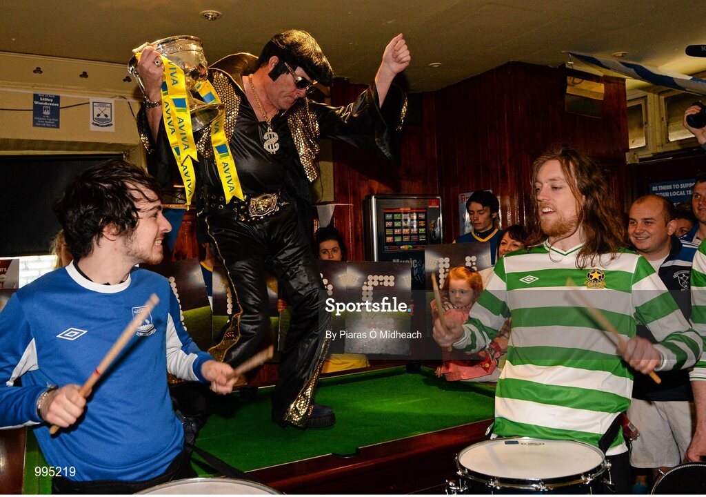 11 May 2015; Michael 'Elvis' Heapes, from Ringsend, entertains the crowd in the Padraig Pearse, after former Republic of Ireland International Kevin Kilbane surprised former Liffey Wanderers' player and manager Parko Kealy with VIP tickets to the FAI Junior Cup Final at the Aviva Stadium on Sunday during the FAI Junior Cup Tour and Community Day. The Padraig Pearse, Pearse Street, Dublin. Picture credit: Piaras Ó Mídheach / SPORTSFILE
