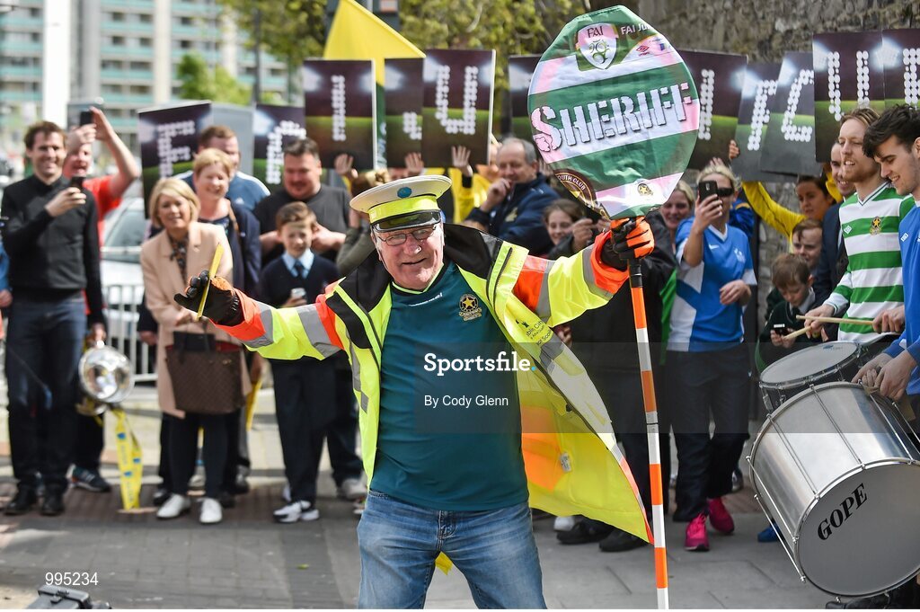 11 May 2015; Sheriff YC legend and lollipop man at St Laurence O'Toole's NS, Seville Place, Noel Kelleher celebrates after being surprised with VIP tickets to the FAI Junior Cup Final at the Aviva Stadium on Sunday by former Republic of Ireland International Kevin Kilbane during the FAI Junior Cup Tour and Community Day. Seville Place, Dublin. Picture credit: Cody Glenn / SPORTSFILE