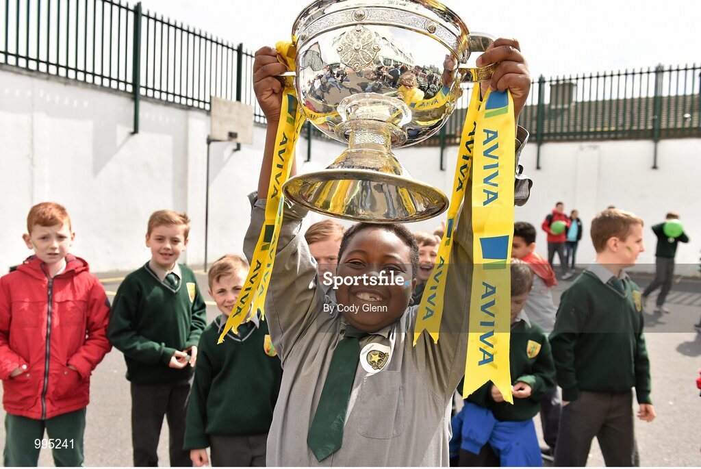 11 May 2015; Kelvin Williams, aged 9, a student at St. Laurence O'Toole NS lifts the FAI Junior Cup during the FAI Jnr Cup Tour and Community Day. Picture credit: Cody Glenn / SPORTSFILE