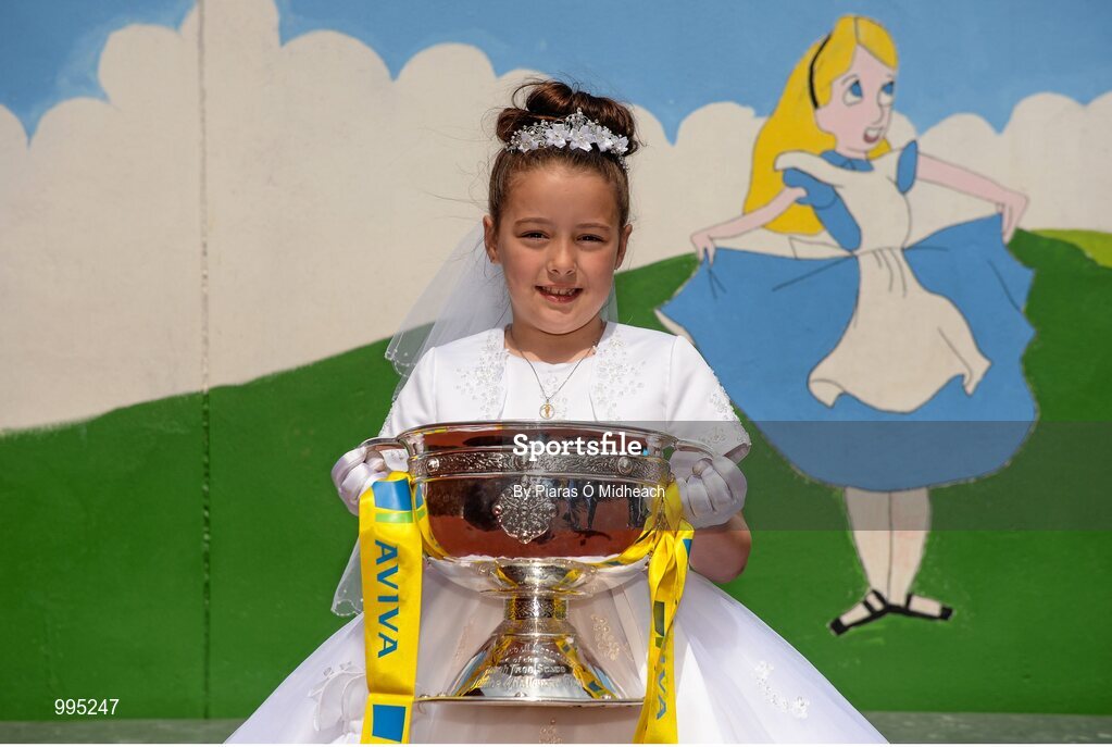 11 May 2015; Holly Kelly, aged 8, from City Quay NS, Gloucester Street South, Dublin, with the FAI Junior Cup during the FAI Junior Cup Tour and Community Day where former Republic of Ireland International Kevin Kilbane surprised two supporters with VIP tickets to the FAI Junior Cup Final at the Aviva Stadium on Sunday. City Quay NS, Gloucester Street South, Dublin. Picture credit: Piaras Ó Mídheach / SPORTSFILE