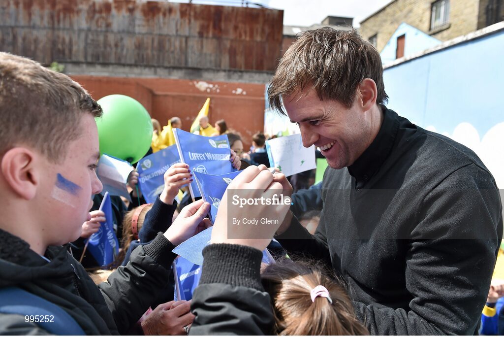 11 May 2015; Former Republic of Ireland International Kevin Kilbane signs autographs to students at City Quay N.S. on Gloucester Street South in Dublin 2 during the FAI Jnr Cup Tour and Community Day. Picture credit: Cody Glenn / SPORTSFILE