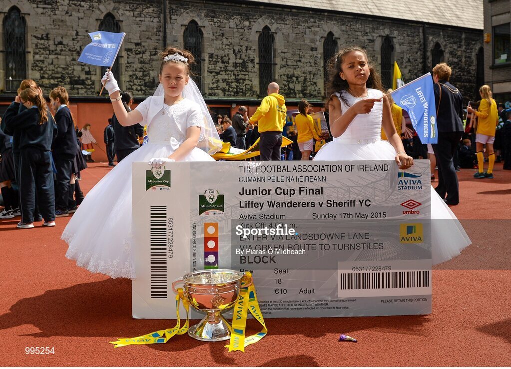 11 May 2015; Holly Kelly, left, and Rihanna Sanni, both aged 8 and from City Quay NS, Gloucester Street South, Dublin, during the FAI Junior Cup Tour and Community Day where former Republic of Ireland International Kevin Kilbane surprised two supporters with VIP tickets to the FAI Junior Cup Final at the Aviva Stadium on Sunday. City Quay NS, Gloucester Street South, Dublin. Picture credit: Piaras Ó Mídheach / SPORTSFILE