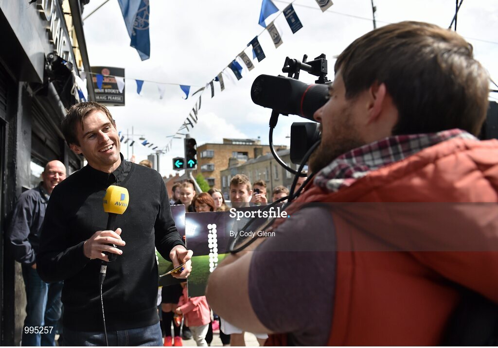 11 May 2015; Former Republic of Ireland International Kevin Kilbane is filmed outside The Padraig Pearse pub by camera man Shane Caffrey during the FAI Junior Cup Tour and Community Day. The Padraig Pearse, Pearse Street, Dublin. Picture credit: Cody Glenn / SPORTSFILE
