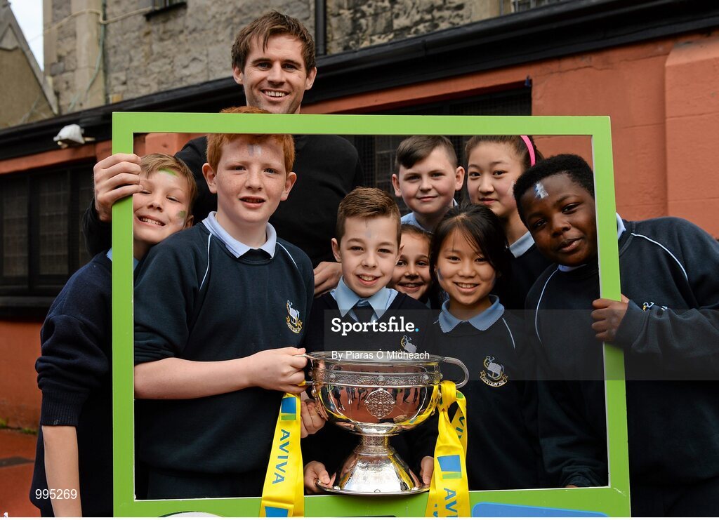 11 May 2015; Former Republic of Ireland International Kevin Kilbane poses for a photograph with children from City Quay NS, Gloucester Street South, Dublin, during the FAI Junior Cup Tour and Community Day where two supporters were surprised with VIP tickets to the FAI Junior Cup Final at the Aviva Stadium on Sunday. City Quay NS, Gloucester Street South, Dublin. Picture credit: Piaras Ó Mídheach / SPORTSFILE