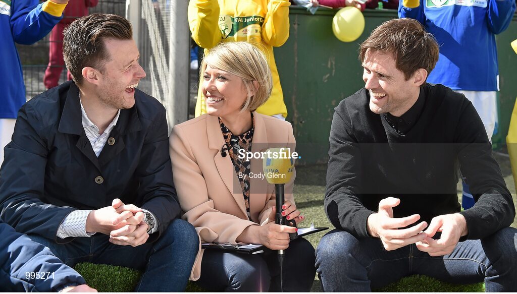 11 May 2015; Ger Treacy, centre, conducts an interview between former League of Ireland footballer Alan Cawley, left, and former Republic of Ireland International Kevin Kilbane to preview Sunday's FAI Junior Cup Final between Liffey Wanderers and Sheriff YC during the FAI Jnr Cup Tour and Community Day. Sheriff Youth Club. Commons Street, Dublin. Picture credit: Cody Glenn / SPORTSFILE
