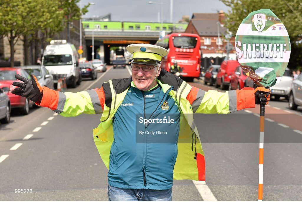 11 May 2015; Sheriff YC legend and lollipop man at St Laurence O'Toole's NS, Seville Place, Noel Kelleher was surprised with VIP tickets to the FAI Junior Cup Final at the Aviva Stadium on Sunday by former Republic of Ireland International Kevin Kilbane, not pictured, during the FAI Junior Cup Tour and Community Day. Seville Place, Dublin. Picture credit: Cody Glenn / SPORTSFILE
