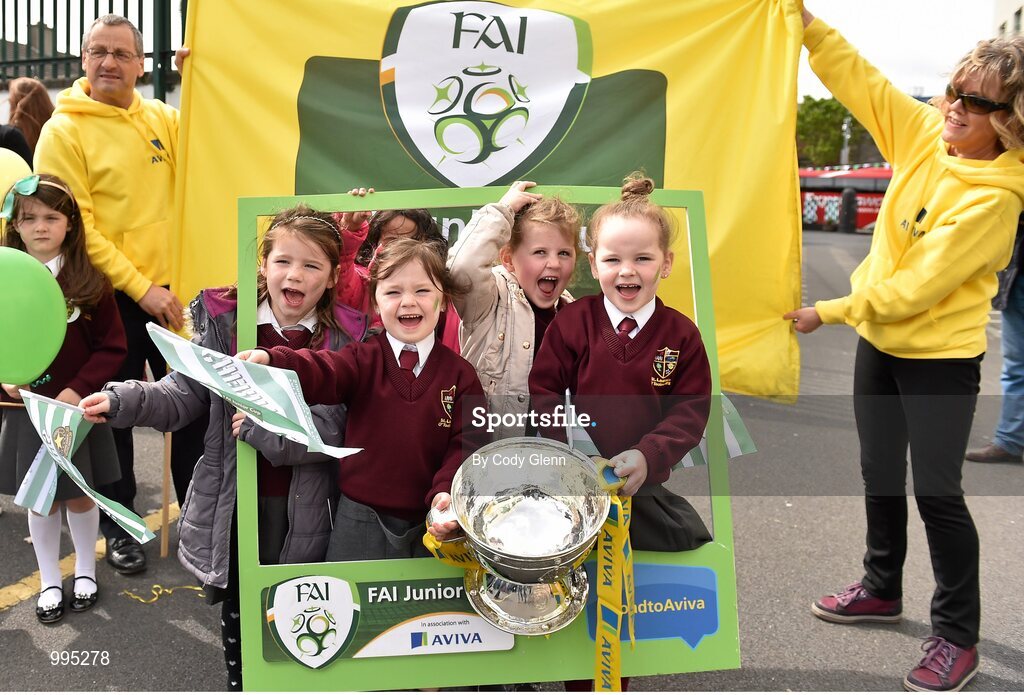 11 May 2015; St. Laurence O'Toole G.N.S. students, from left in frame, Heidi Butler, Dani Downey, Libby Gannon and Ellie Byrne show their support for Sheriff YC during the FAI Jnr Cup Tour and Community Day with the FAI flag held by Aviva employees Peter Vincent, left, a motor underwriter, and Breda Judge, volunteer coordinator. St. Laurence O'Toole NS. Dublin. Picture credit: Cody Glenn / SPORTSFILE