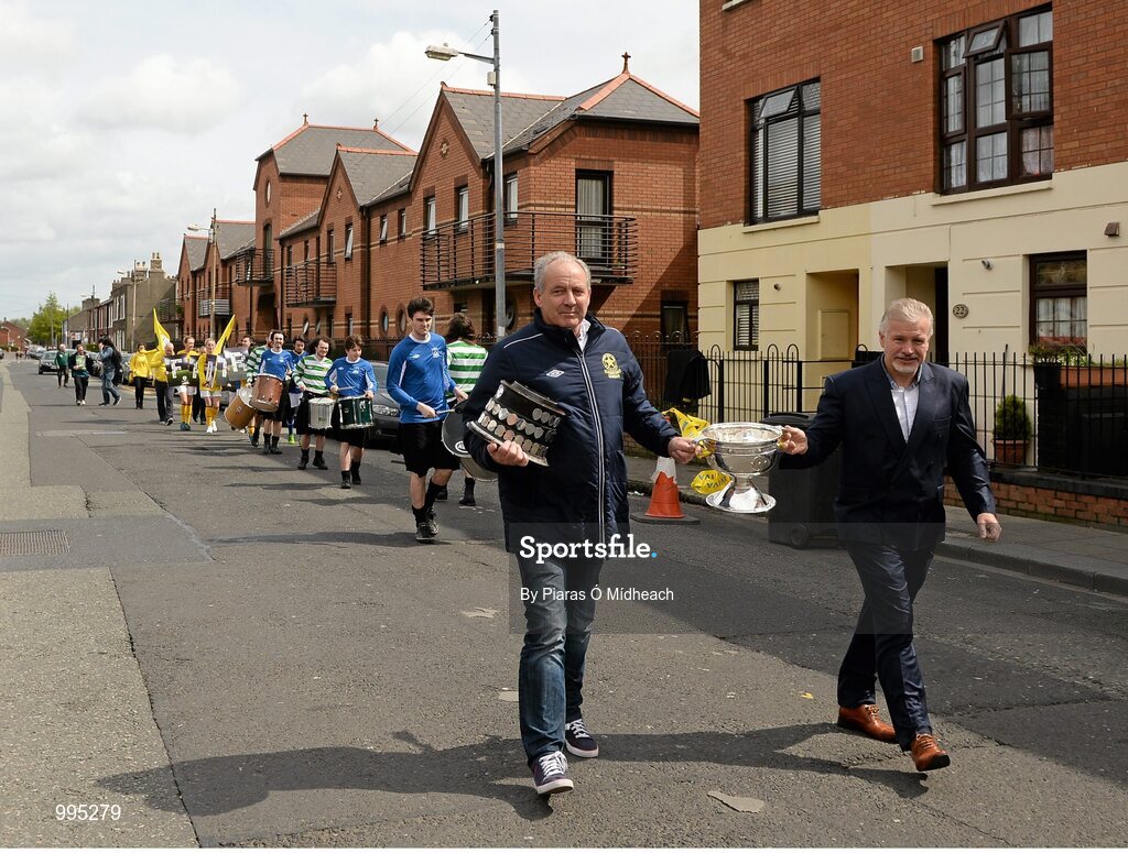 11 May 2015; Hugh Richardson, left, Sheriff YC club secretary, and Luke Ivory, Sheriff YC committee member, parade the FAI Junior Cup to Sheriff Youth Club during the FAI Junior Cup Tour and Community Day, where two supporters were surprised with VIP tickets to the FAI Junior Cup Final at the Aviva Stadium on Sunday by former Republic of Ireland International Kevin Kilbane. Sheriff Street, Dublin. Picture credit: Piaras Ó Mídheach / SPORTSFILE