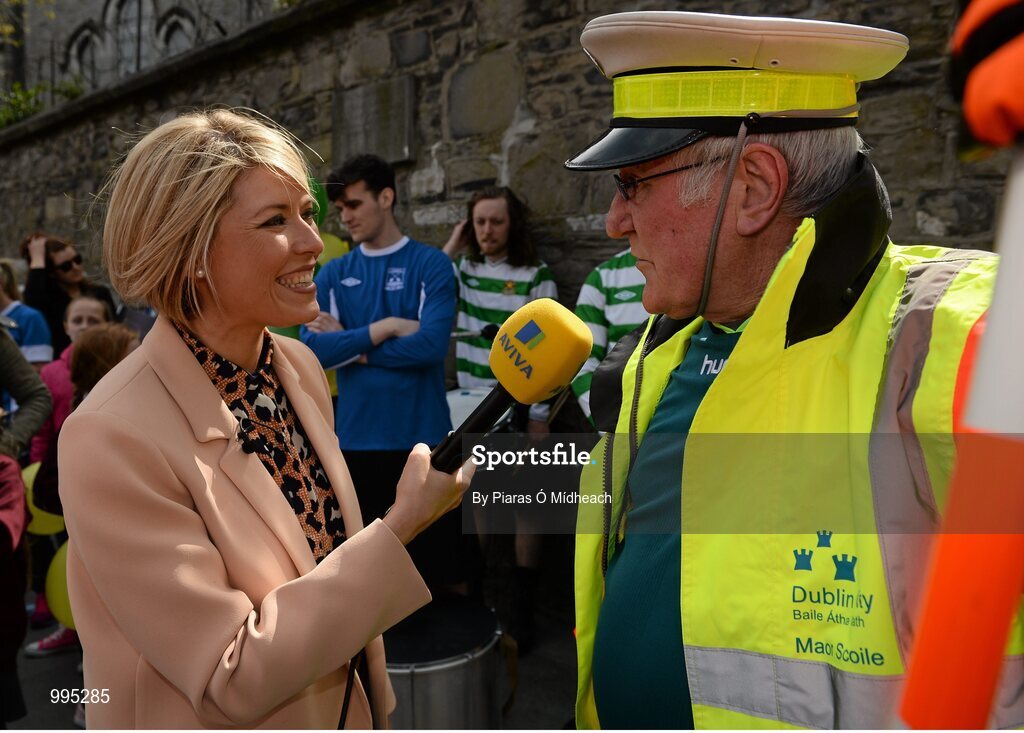 11 May 2015; Sheriff YC legend Noel Kelligher, and lollipop man at St Laurence O'Toole's NS on Seville Place in inner city, is interviewed by Ger Treacy after he was surprised by former Republic of Ireland International Kevin Kilbane with VIP tickets to the FAI Junior Cup Final at the Aviva Stadium on Sunday during the FAI Junior Cup Tour and Community Day. Seville Place, Dublin. Picture credit: Piaras Ó Mídheach / SPORTSFILE