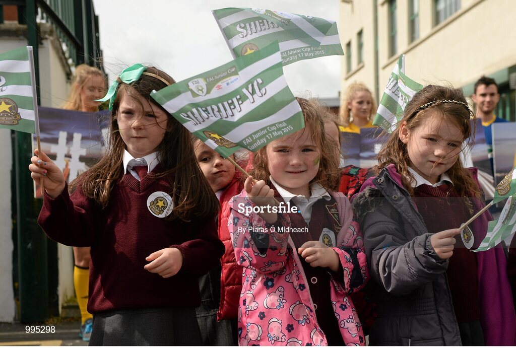 11 May 2015; Children from St Laurence O'Toole's NS, Seville Place, from left, Eve McDermott, Cara Watson and Heidi Butler, all aged 5, from Sheriff Street, during the FAI Junior Cup Tour and Community Day, where two supporters were surprised with VIP tickets to the FAI Junior Cup Final at the Aviva Stadium on Sunday by former Republic of Ireland International Kevin Kilbane. O'Toole's NS, Seville Place. Picture credit: Piaras Ó Mídheach / SPORTSFILE
