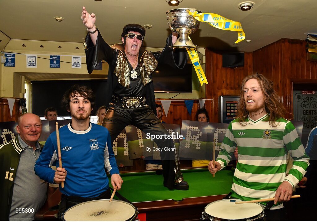 11 May 2015; Michael 'Elvis' Heapes of Ringsend dances to the sounds of Hit Machine Drummers Michael Flemming, left, and Daniel Lang on the pool table at The Padraig Pearse pub during a stop on the FAI Jnr Cup Tour and Community Day. The Padraig Pearse pub, Pearse Street, Dublin. Picture credit: Cody Glenn / SPORTSFILE