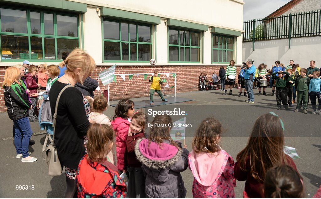 11 May 2015; Children from St Laurence O'Toole's NS, Seville Place, during the FAI Junior Cup Tour and Community Day, where two supporters were surprised with VIP tickets to the FAI Junior Cup Final at the Aviva Stadium on Sunday by former Republic of Ireland International Kevin Kilbane. O'Toole's NS, Seville Place. Picture credit: Piaras Ó Mídheach / SPORTSFILE