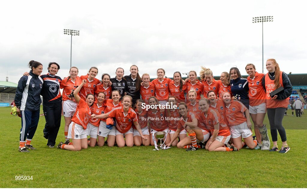 9 May 2015; The Armagh squad celebrate after the game. TESCO HomeGrown Ladies National Football League, Division 2 Final, Armagh v Donegal. Parnell Park, Dublin. Picture credit: Piaras Ó Mídheach / SPORTSFILE
