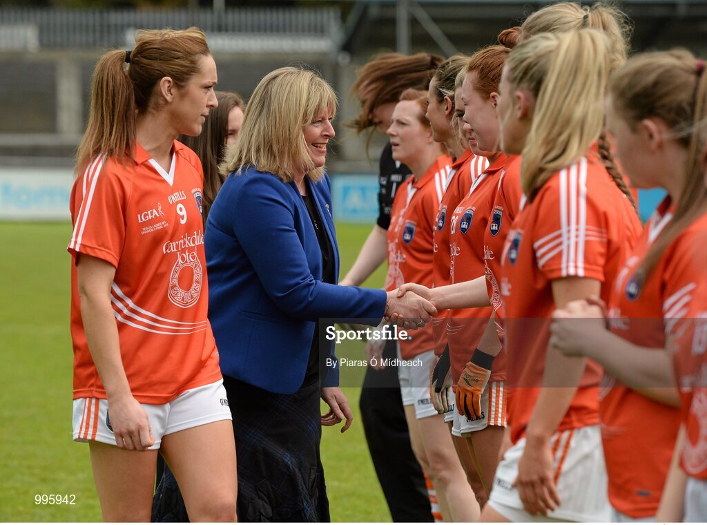 9 May 2015; Maire Hickey, President of Ladies Gaelic Football Association, is introduced to the Armagh team by captain Caroline O'Hanlon. TESCO HomeGrown Ladies National Football League, Division 2 Final, Armagh v Donegal. Parnell Park, Dublin. Picture credit: Piaras Ó Mídheach / SPORTSFILE