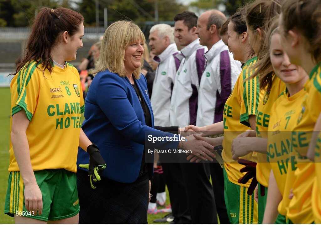 9 May 2015; Maire Hickey, President of Ladies Gaelic Football Association, is introduced to the Donegal team by captain Katy Herron. TESCO HomeGrown Ladies National Football League, Division 2 Final, Armagh v Donegal. Parnell Park, Dublin. Picture credit: Piaras Ó Mídheach / SPORTSFILE