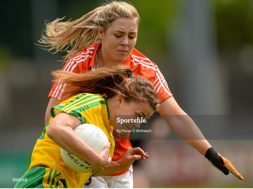 9 May 2015; Niamh Hegarty, Donegal, in action against Niamh Henderson, Armagh. TESCO HomeGrown Ladies National Football League, Division 2 Final, Armagh v Donegal. Parnell Park, Dublin. Picture credit: Piaras Ó Mídheach / SPORTSFILE