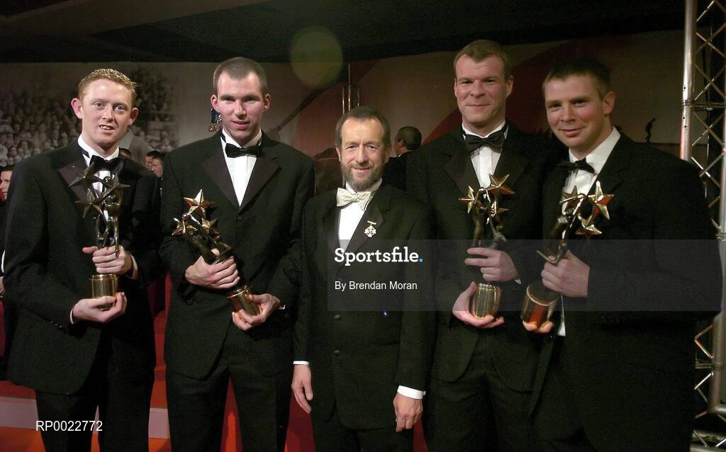 25 November 2005; Kerry All-Stars, from left, Colm Cooper, Michael McCarthy, Diarmuid Murphy, and Tomas O Se, with GAA President Sean Kelly at the 2005 Vodafone GAA All-Star Awards. Citywest Hotel, Dublin. Picture credit: Brendan Moran / SPORTSFILE