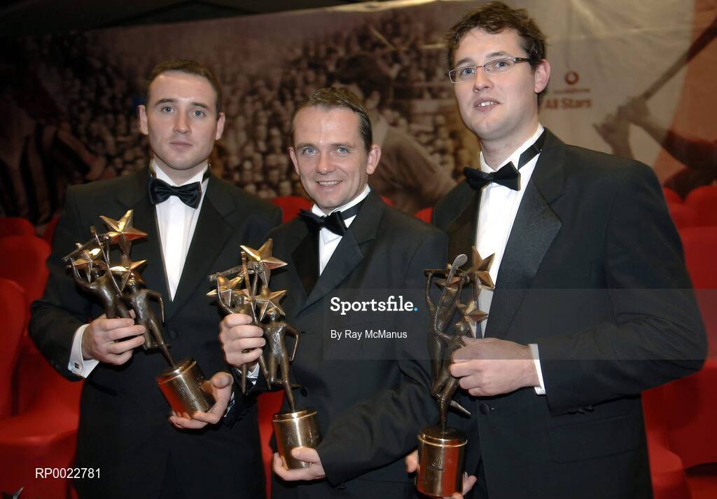 25 November 2005; Eoin Kelly, left and Paul Kelly, from Tipperary, with David Fitzgerald, from Clare, at the 2005 Vodafone GAA All-Star Awards. Citywest Hotel, Dublin. Picture credit: Ray McManus / SPORTSFILE