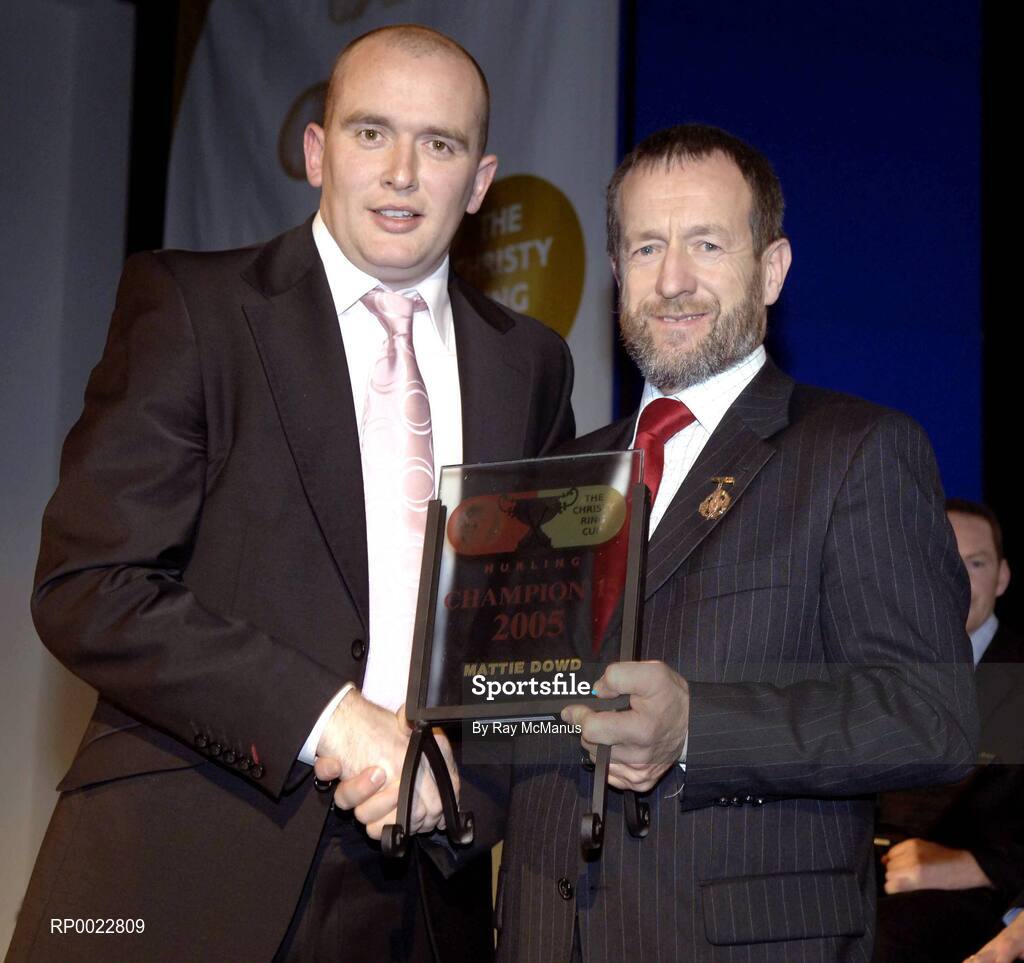26 November 2005; Mattie Dowd, Kildare, is presented with his Christy Ring Cup 'Hurling Champion 15' award by GAA President Sean Kelly. Nicky Rackard and Christy Ring Cup Awards. Croke Park, Jones Road, Dublin. Picture credit: Ray McManus / SPORTSFILE