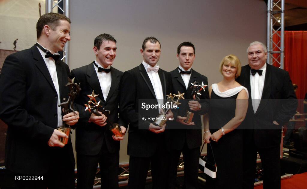 25 November 2005; Armagh players, from left, Paul McGrane, Andy Mallon, Steven McDonnell and Aaron Kernan with Patricia and Joe Kernan at the 2005 Vodafone GAA All-Star Awards. Citywest Hotel, Dublin. Picture credit: Ray McManus / SPORTSFILE