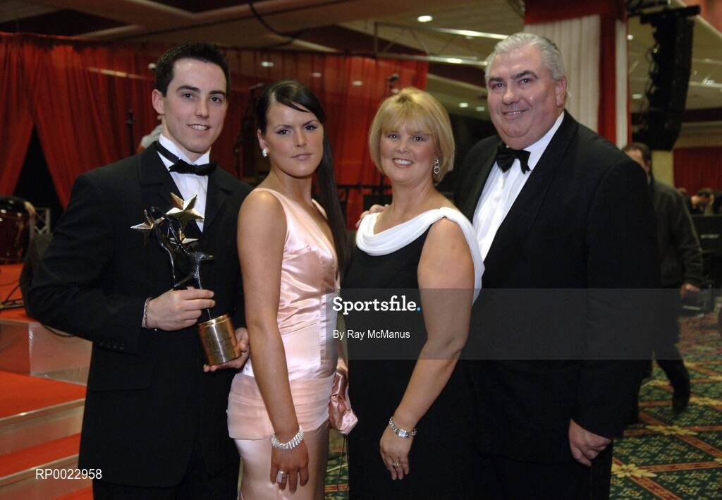 25 November 2005; Young Player of the Year Aaron Kernan, left, with Marian Waters and his parents Patricia and Joe Kernan at the 2005 Vodafone GAA All-Star Awards. Citywest Hotel, Dublin. Picture credit: Ray McManus / SPORTSFILE