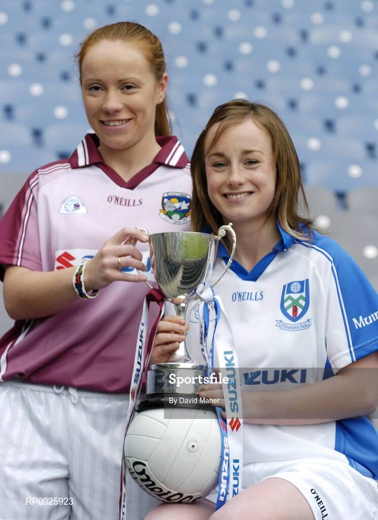 3 May 2006; Footballers Carmel Coleman, left, Galway, and Anita Newell, Monaghan, at a photocall in advance of the Suzuki Ladies National Football League Finals. The Division 1 and 2 Final take place on Saturday May 6th in Parnell Park, Dublin. The Division 1 Final, between Cork and Meath, followed by the Division 2 Final, between Kildare and Laois. The Division 3 Finals are to be played on Sunday May 7th in Pairc Chiarain, Athlone, Co. Westmeath. The Division 3 Final are Clare against Leitrim, and The Division 3B Final between Monaghan and Galway. Croke Park Dublin. Picture credit: David Maher / SPORTSFILE