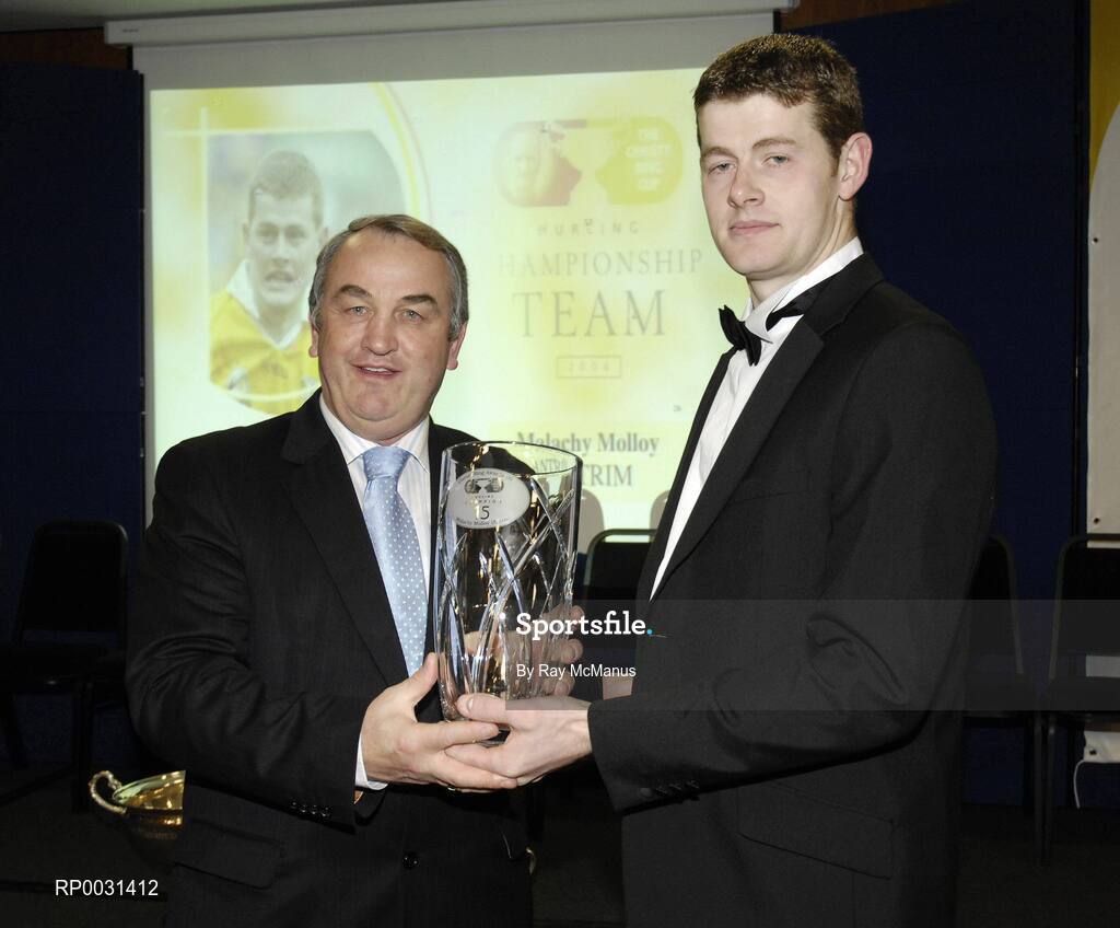 18 November 2006; Malachy Molloy, Antrim, is presented with his award by GAA President Nickey Brennan at the 2006 Christy Ring Cup "Champion 15" Awards. Croke Park, Dublin. Picture credit: Ray McManus / SPORTSFILE