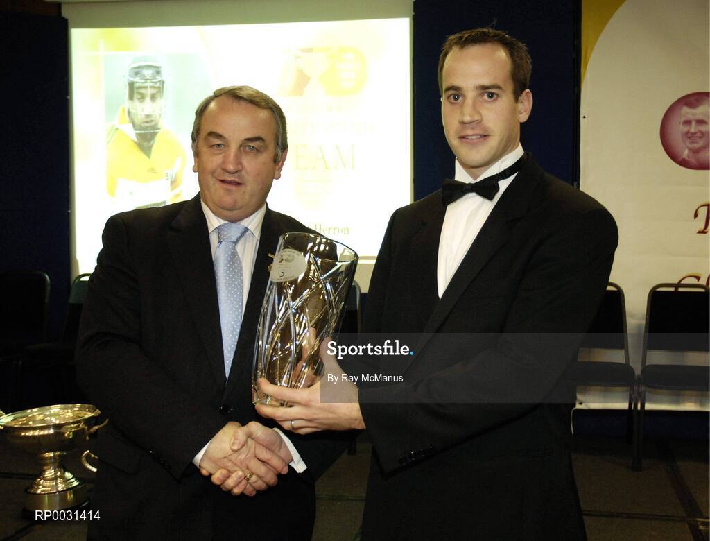 18 November 2006; Ciaran Herron, Antrim, is presented with his award by GAA President Nickey Brennan at the 2006 Christy Ring Cup "Champion 15" Awards. Croke Park, Dublin. Picture credit: Ray McManus / SPORTSFILE