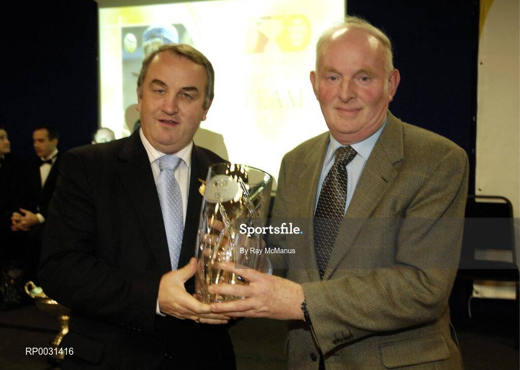 18 November 2006; Jim Hannon accepts an award on behalf of his son, the Kildare player Eoin, from GAA President Nickey Brennan at the 2006 Christy Ring Cup "Champion 15" Awards. Croke Park, Dublin. Picture credit: Ray McManus / SPORTSFILE