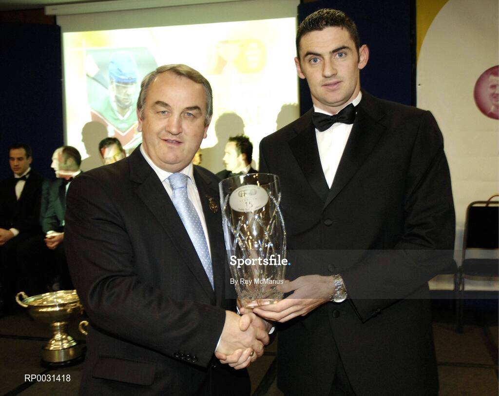 18 November 2006; Paddy Barrett, Mayo, is presented with his award by GAA President Nickey Brennan at the 2006 Christy Ring Cup "Champion 15" Awards. Croke Park, Dublin. Picture credit: Ray McManus / SPORTSFILE