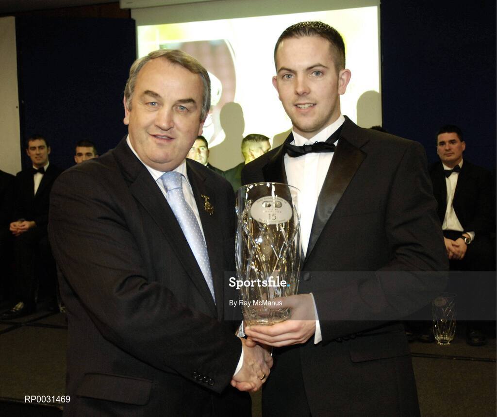 18 November 2006; Barry Winders, Tyrone, is presented with his award by GAA President Nickey Brennan at the 2006 Nicky Rackard Cups "Champion 15" Awards. Croke Park, Dublin. Picture credit: Ray McManus / SPORTSFILE