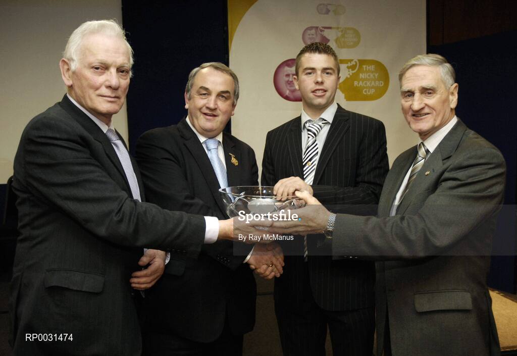 18 November 2006; Paul McCormack, Armagh, is presented with his 'Fair Play' award by GAA President Nickey Brennan, accompanied by 'Legends' winners Jimmy Smyth, Clare, left, and Donie Nealon, Tipperary, right, at the 2006 Christy Ring / Nicky Rackard Cups "Champion 15" Awards. Croke Park, Dublin. Picture credit: Ray McManus / SPORTSFILE