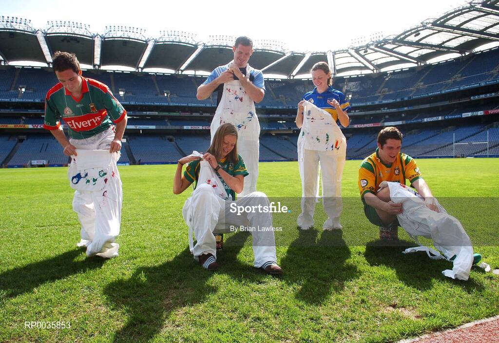 11 April 2007; GAA stars, from left, Alan Dillon, Mayo, Grainne Nulty, Meath, Darren Magee, Dublin, Suzanne Kelly, Tipperary and Kevin Cassidy change into overalls at the launch of the Crown Paints GAA County Colours Promotion. The Crown Paints County Colours range is a specially developed range of 32 colour schemes, each representing a county's GAA colours. GAA fans will be able to adorn their bedrooms or houses in their county colours. Croke Park, Dublin. Picture credit: Brian Lawless / SPORTSFILE