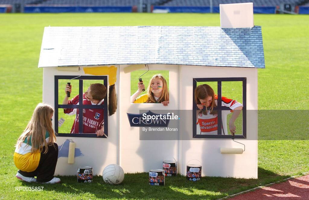 11 April 2007; At the launch of the Crown Paints GAA County Colours Promotion, are, from left, Keeva Dagg, age 9, Offaly, Sean Newman, age 11, Galway, Sophie Breslin, age 9, Kerry and Emma Dunne, age 12, Derry. The Crown Paints County Colours range is a specially developed range of 32 colour schemes, each representing a county's GAA colours. GAA fans will be able to adorn their bedrooms or houses in their county colours. Croke Park, Dublin. Picture credit: Brendan Moran / SPORTSFILE