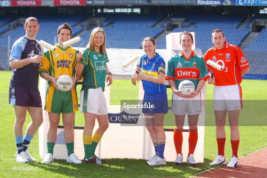11 April 2007; GAA stars, from left, Darren Magee, Dublin, Kevin Cassidy, Donegal, Grainne Nulty, Meath, Suzanne Kelly, Tipperary, Alan Dillon, Mayo, John Gardiner, Cork, at the launch of the Crown Paints GAA County Colours Promotion. The County Colours range is a specially developed range of 32 colour schemes, each representing a county's GAA colours. GAA fans will be able to adorn their bedrooms or houses in their county colours. Croke Park, Dublin. Picture credit: Brendan Moran / SPORTSFILE