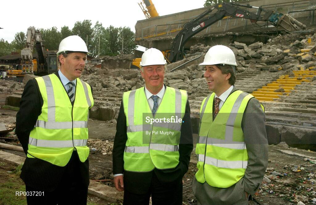 17 May 2007; Mr John O’Donoghue, TD, Minister for Arts, Sport and Tourism, centre, with IRFU Chief Executive Philip Browne, left, and John Delaney, Chief Executive of the FAI, visit Lansdowne Road Stadium before work commenced on its demolition. Lansdowne Road Stadium, Dublin. Picture credit: Pat Murphy / SPORTSFILE