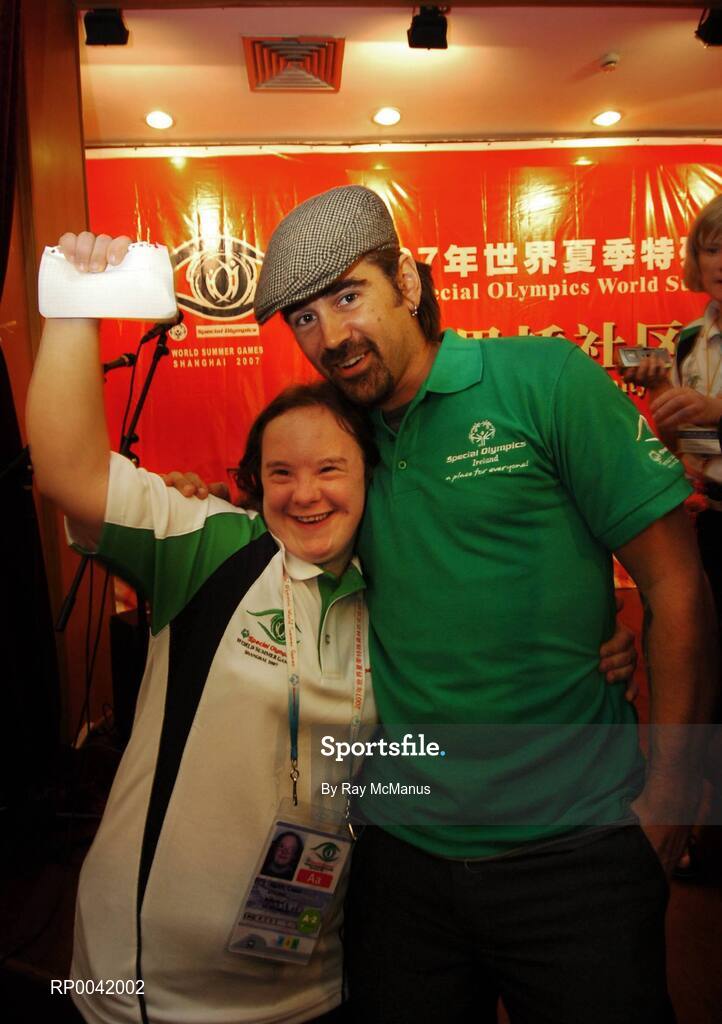 1 October 2007; Hollywood actor Colin Farrell with Carol Nairn from Ferrybank in Waterford, who will represent Ireland on a basketball team, at the reception for Special Olympic Athletes and Volunteers. 2007 Special Olympics World Summer Games, Pearl Hotel, Shanghai, China. Picture credit: Ray McManus / SPORTSFILE