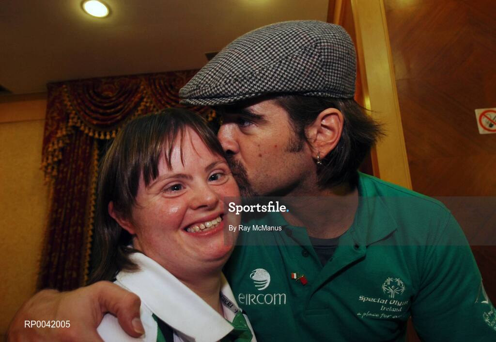 1 October 2007; Hollywood actor Colin Farrell with Deirdre Garvin, Claremorris, Co. Mayo, who will represent Ireland in bowling, at the reception for Special Olympic Athletes and Volunteers. 2007 Special Olympics World Summer Games, Pearl Hotel, Shanghai, China. Picture credit: Ray McManus / SPORTSFILE
